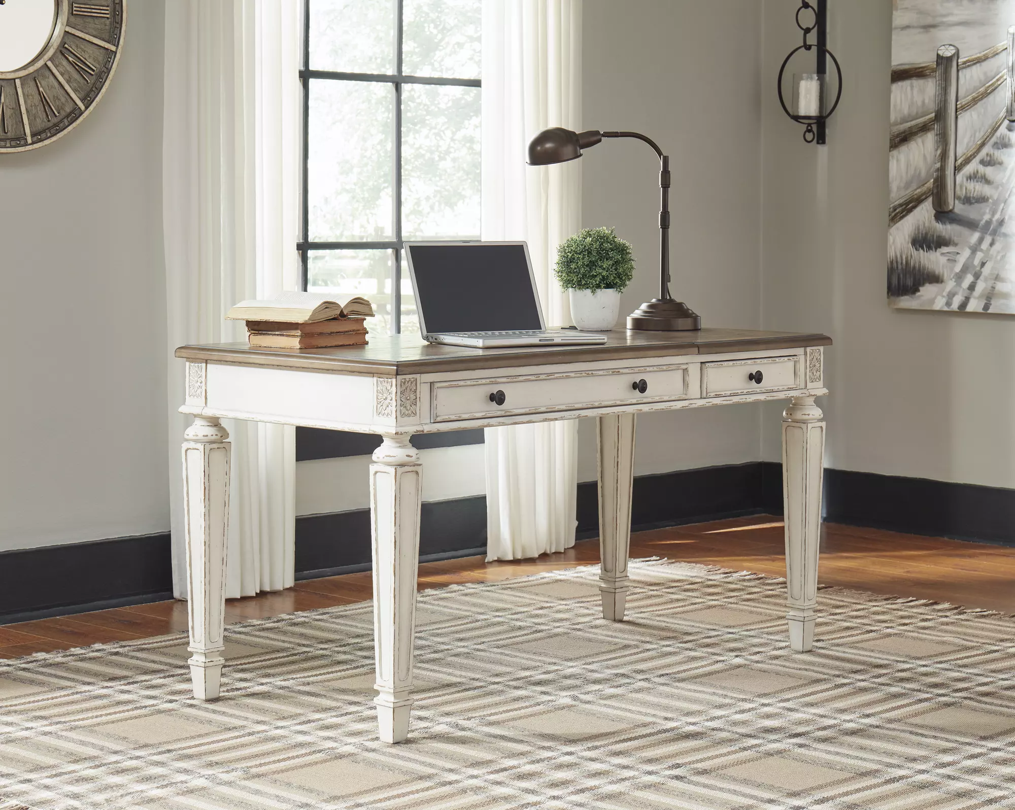 Elevating the art of traditional cottage styling, this desk is your heavenly home office realized. Its antiqued two-tone aesthetic blends a chipped white with a distressed wood tone top for added charm. Framed drawer fronts, decorative corbels and elegantly turned and tapered legs add refinement, while dark bronze-tone knobs lend a classic touch. And this desk is also built for productivity. A spring lift top raises the surface to a comfortable standing position, while the built-in power supply and dual USB ports keep your devices close at hand and ready to go.