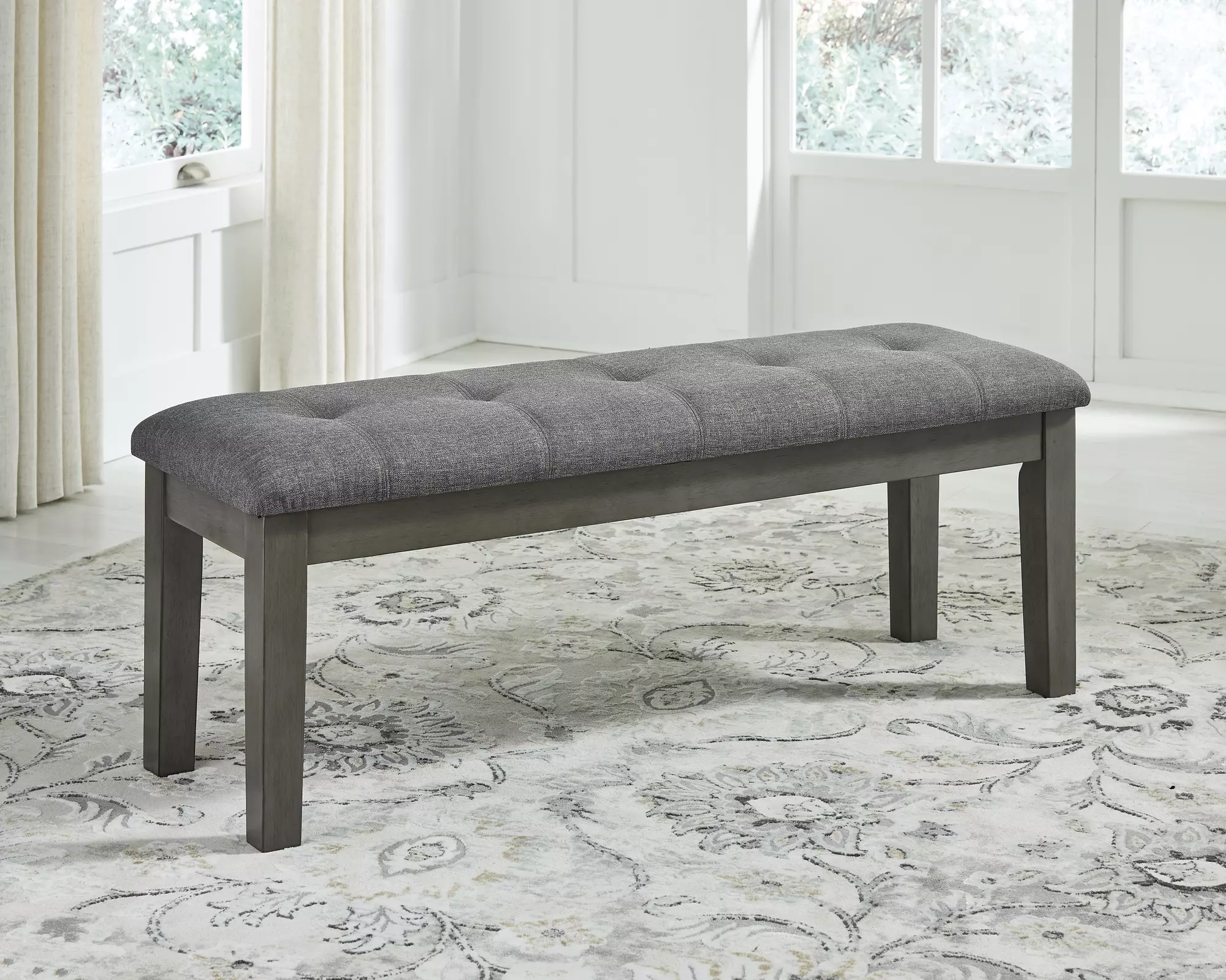 DescriptionCool and on-trend. This dining bench sports a two-tone gray look for a contemporary-yet-casual feel. The cushioned foam seat in a gray textural fabric pairs seamlessly with the antiqued gray finish, providing you with a super-stylish and versatile seating option.