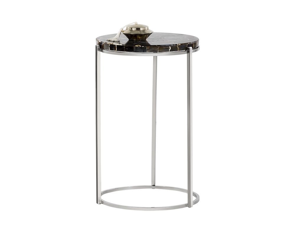 Description: TILLIE END TABLE - STAINLESS STEEL - BLACK AGATE STONE